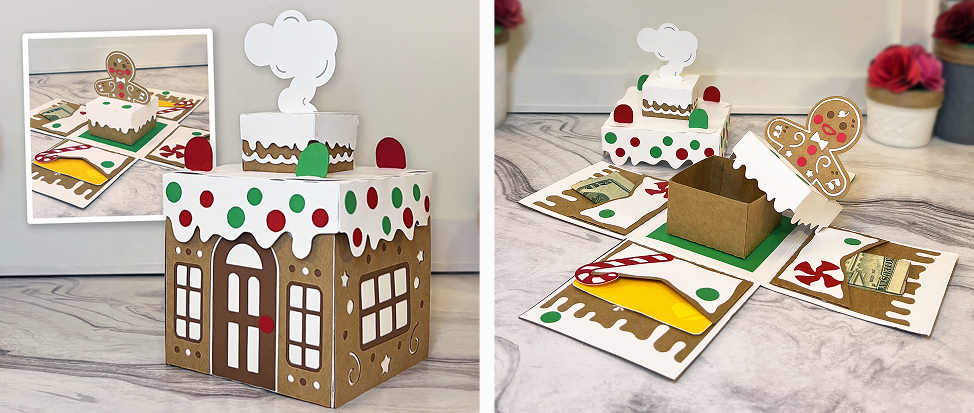 The holidays are the perfect time to add a little magic to your gift-giving, and this Gingerbread House Explosion Box is just the thing! On the outside, it looks like an adorable gingerbread house, complete with a chimney and “smoke.” But when the lid comes off, it bursts open to reveal hidden slots for gift cards or cash, plus a cute gingerbread man guarding a secret mini box for small goodies.